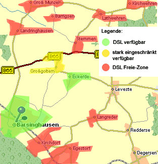 T-DSL kann nur betrieben werden, wenn die Entfernung zwischen dem Kunden und der Telekom Vermittlungsstelle nicht mehr als ca. 4,5km beträgt. Dies ist natürlich in einer großen Stadt nicht das Problem, aber auf dem Lande! Dies ist die Krankheit unter der z.B. die Ortschaften Stemmen und Barrigsen leiden.
